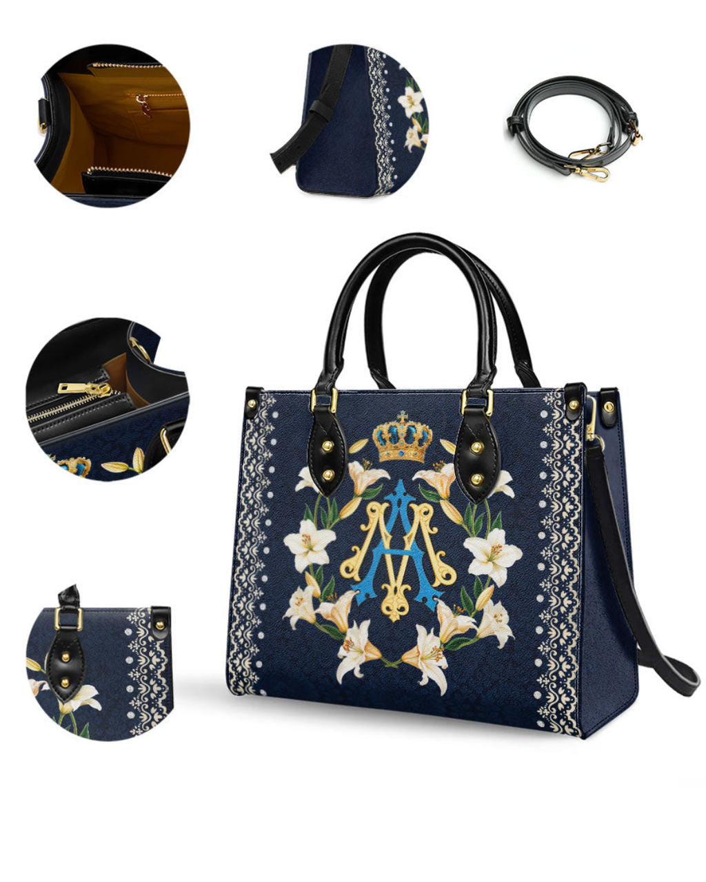A arte desta bolsa destaca a Virgem Maria como Rainha do Céu. com a coroa simbolizando sua graça divina e os lírios representando pureza. esperança e renovação. A harmonia das cores e dos elementos transmite serenidade e espiritualidade. refletindo fé e reverência em cada detalhe.
