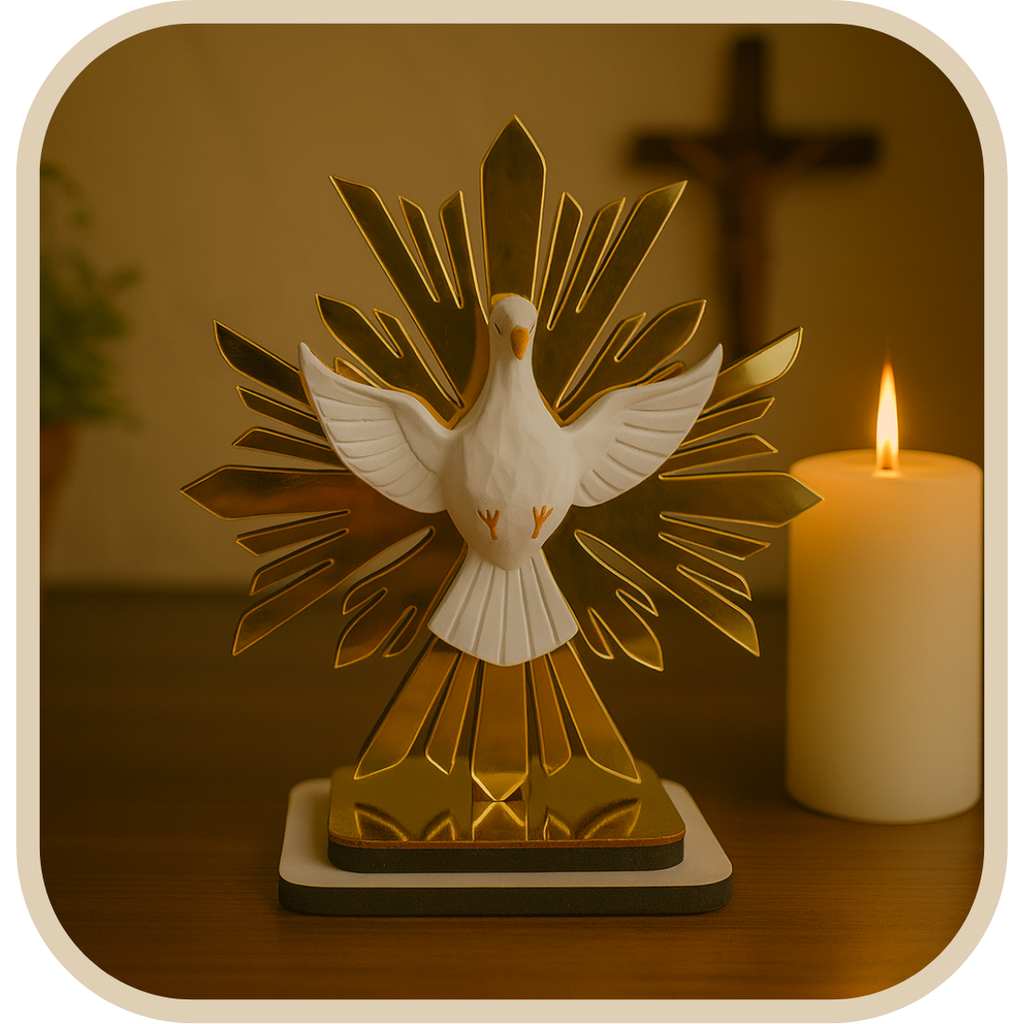 Uma peça que simboliza proteção. luz e presença divina no lar. Este Divino Espírito Santo de mesa possui 17 cm de altura. com acabamento dourado e perolado que realça cada detalhe. tornando a decoração ainda mais acolhedora e cheia de fé.