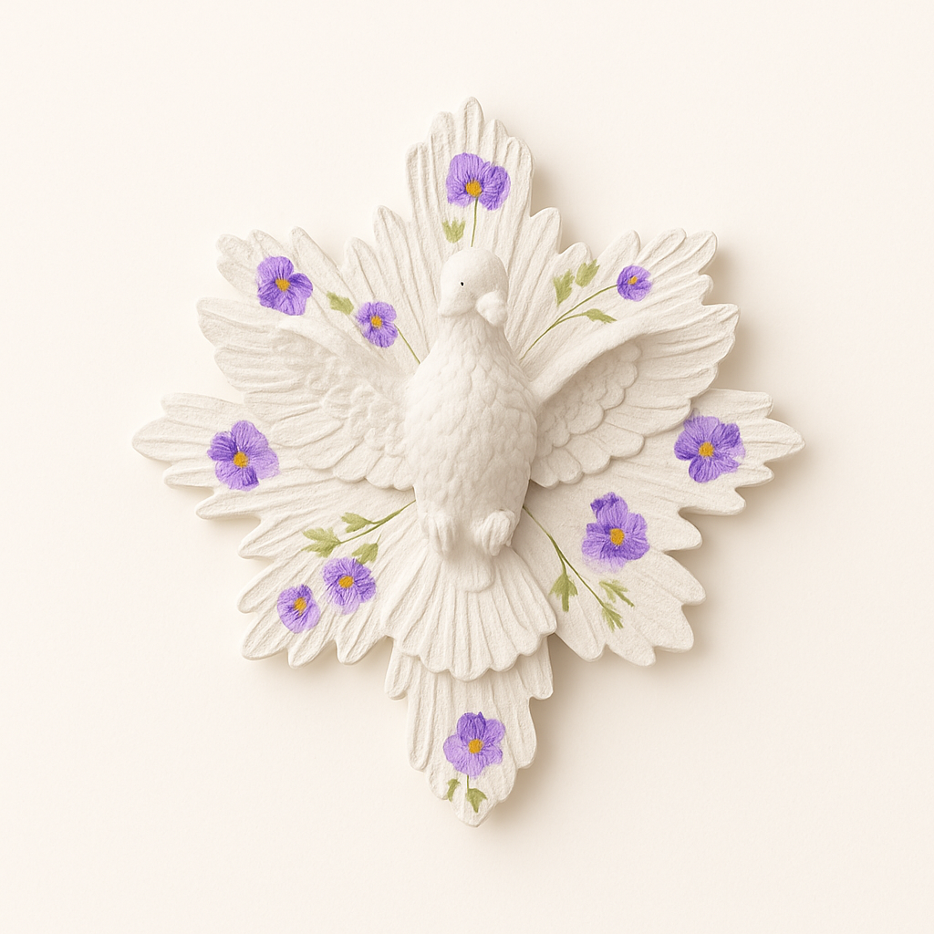 Uma peça que transmite leveza e espiritualidade! Esta representação do Divino Espírito Santo traz detalhes florais pintados à mão. simbolizando a presença do Espírito de Deus e a renovação da vida.