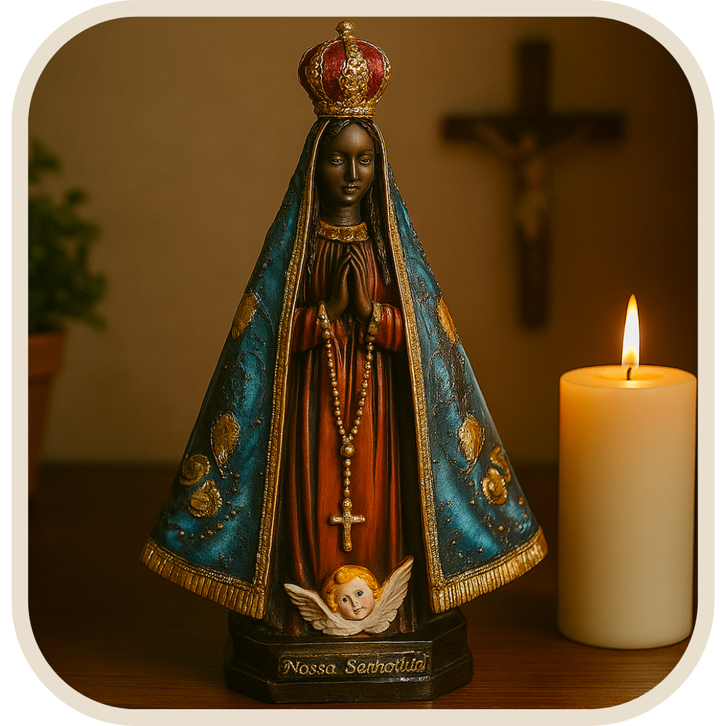 Esta imagem representa Nossa Senhora Aparecida. símbolo de fé. proteção e devoção. Com acabamento detalhado no estilo italiano. transmite elegância e serenidade. sendo perfeita para momentos de oração e decoração de ambientes religiosos.