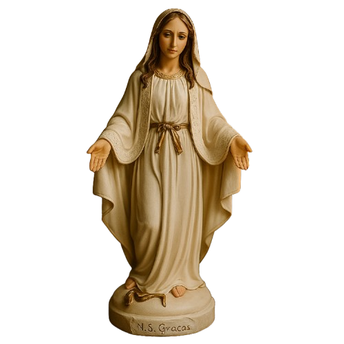 Esta imagem representa Nossa Senhora das Graças. símbolo de fé. proteção e intercessão divina. Com acabamento branco perolado. transmite serenidade. elegância e devoção. sendo perfeita para momentos de oração e decoração de ambientes religiosos.