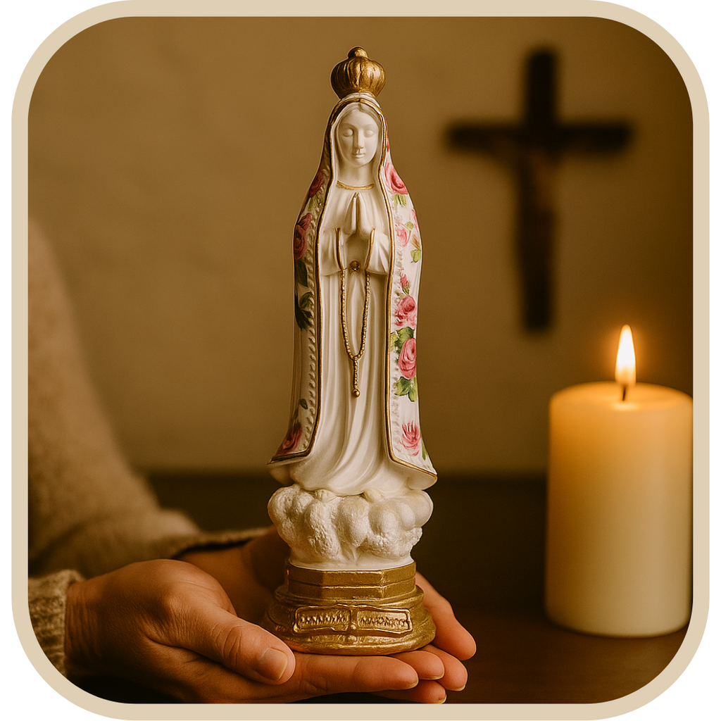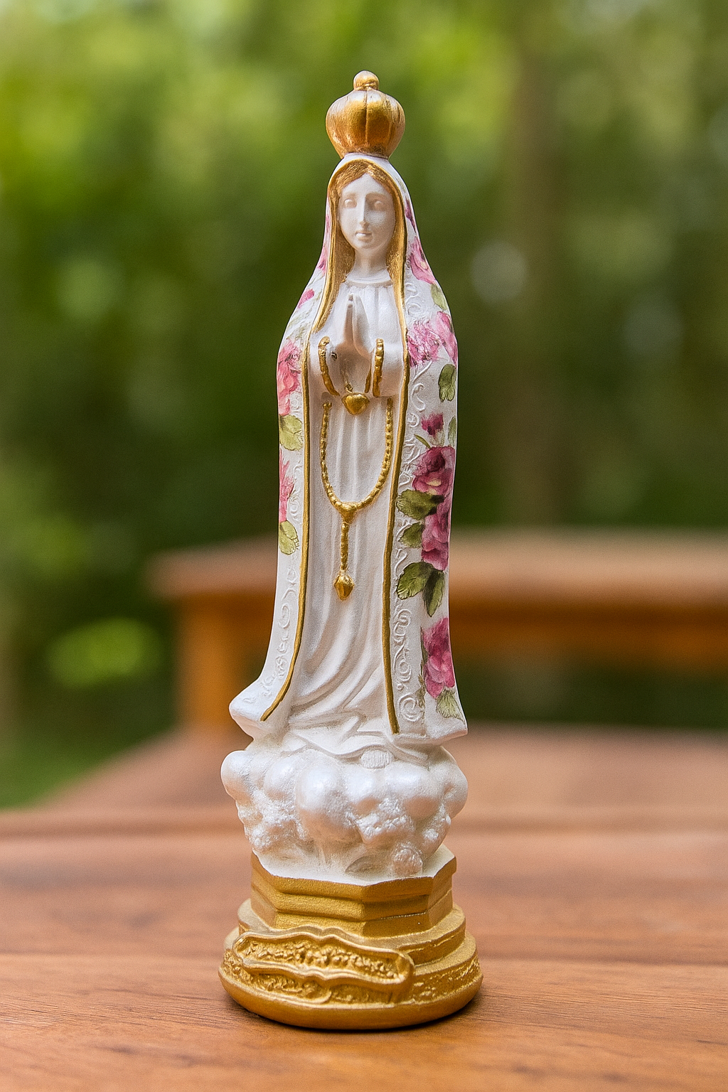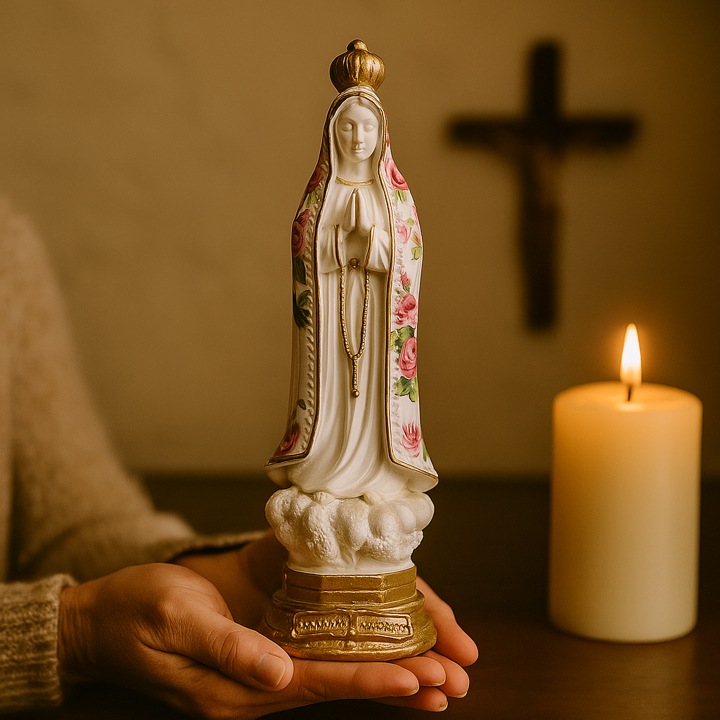 Uma peça cheia de ternura e espiritualidade. Esta imagem de Nossa Senhora de Fátima traz um manto decorado com flores em tons de rosa e detalhes suaves que transmitem amor e doçura. Ideal para quem deseja um toque de beleza e fé no oratório ou no quarto.
