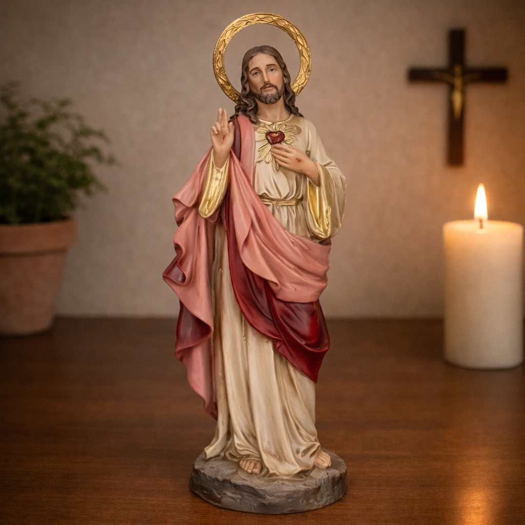 Linda Imagem do Sagrado Coração de Jesus. símbolo do amor infinito. misericórdia e proteção divina. Com expressão serena e acabamento artesanal rico em detalhes. transmite fé. acolhimento e espiritualidade ao ambiente.