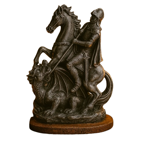 Esta imagem representa São Jorge montado em seu cavalo guerreiro. símbolo de coragem. proteção e fé. Feita em resina com acabamento prateado. transmite força e devoção. sendo perfeita para decoração de ambientes religiosos ou como peça de inspiração e proteção.