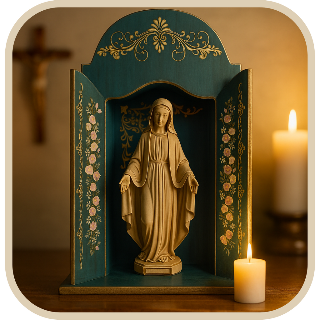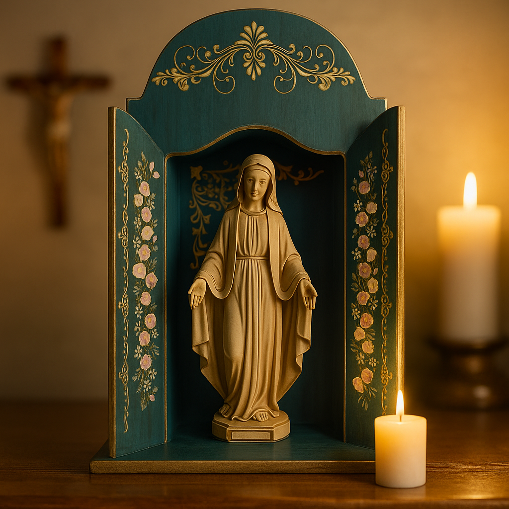 Um oratório que carrega fé em cada detalhe. As flores pintadas à mão criam um espaço íntimo. onde a oração se torna mais profunda e o lar mais cheio de Deus. ✨🙏