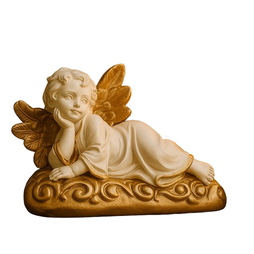 Esta imagem representa um Anjinho da Guarda deitado. simbolizando proteção. paz e cuidado divino. Feito em gesso com acabamento perolado e detalhes dourados. traz delicadeza e serenidade. sendo perfeito para decoração de ambientes devocionais ou lembranças de fé.