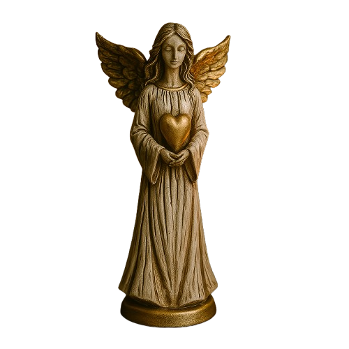 Esta imagem representa um Anjo da Guarda segurando um coração. simbolizando proteção. amor e cuidado divino. Com acabamento marmorizado. transmite serenidade e elegância. sendo perfeito para momentos de oração ou como peça decorativa devocional.