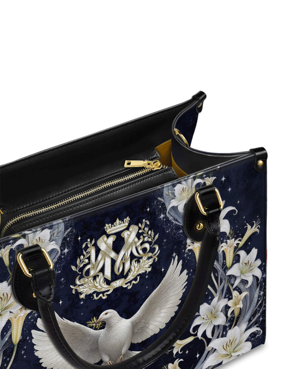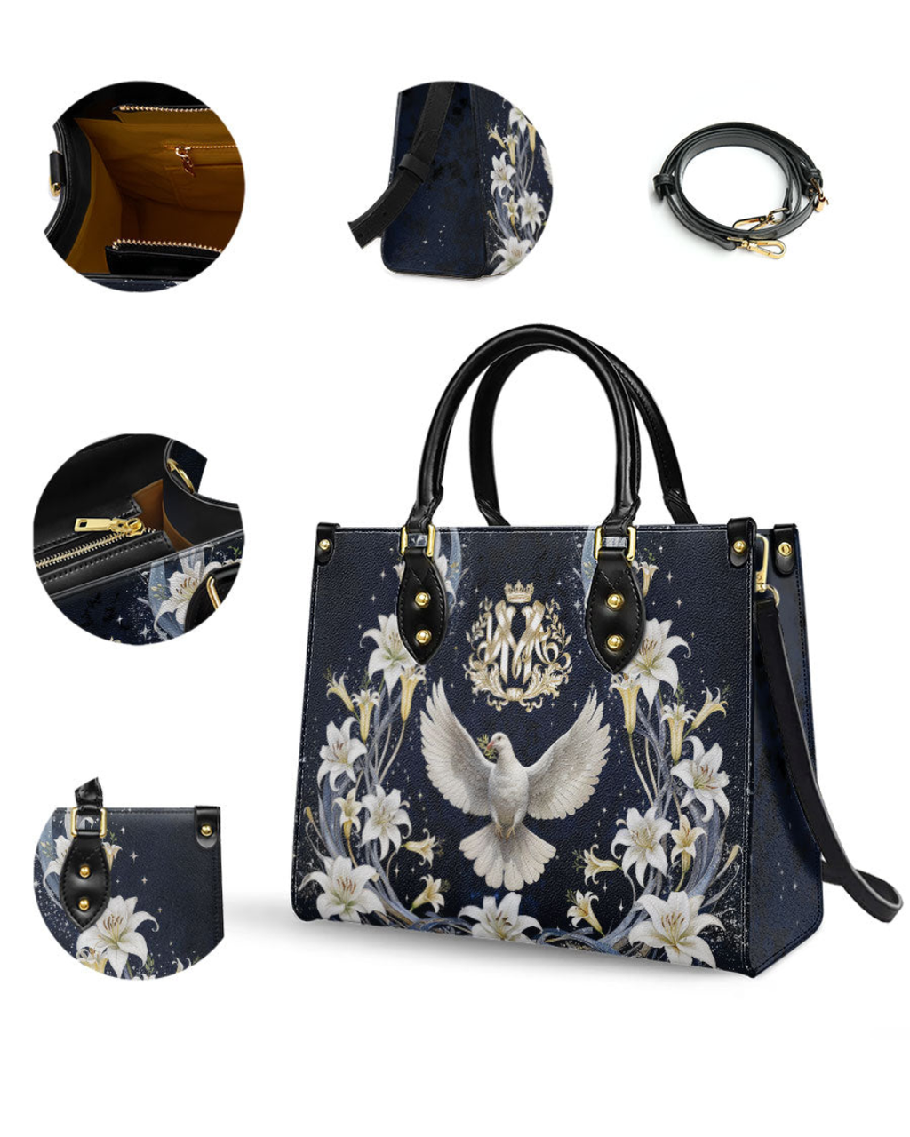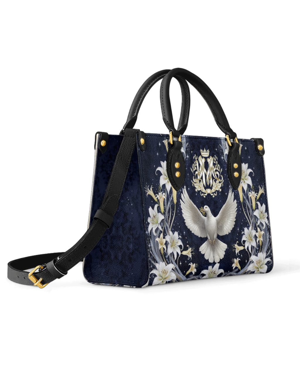 Uma bolsa em couro que expressa fé e sofisticação. com a imagem do Espírito Santo representado pela pomba branca de asas abertas. símbolo de paz e proteção divina. O fundo azul estrelado e os lírios com detalhes dourados remetem à pureza. à graça de Nossa Senhora e à beleza dos céus.