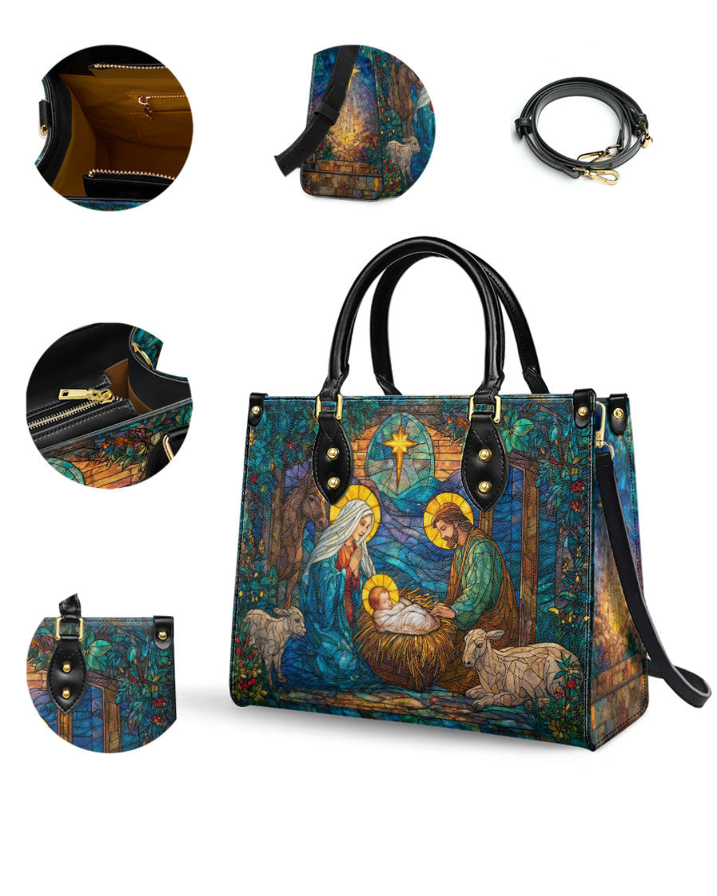 Esta bolsa radiante retrata o Santo Nascimento. Maria e José contemplando o Cristo recém-nascido sob a Estrela de Belém. cercados pela beleza humilde da criação. Representada em uma arte atemporal de vitral. a cena reflete paz. devoção e o milagre do amor de Deus feito carne.