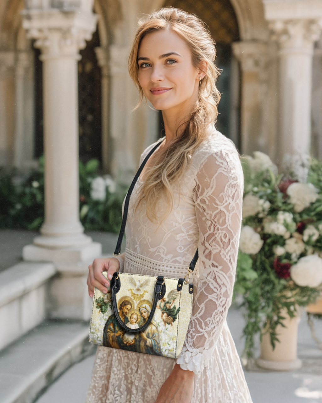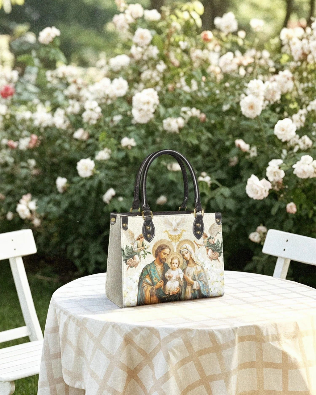 Esta bolsa de couro traz uma delicada representação da Sagrada Família: Jesus. Maria e José. envolta por anjos e lírios. símbolos de amor divino. proteção e união. Sua arte em tons serenos transmite paz. esperança e espiritualidade. tornando cada detalhe uma verdadeira expressão de fé.