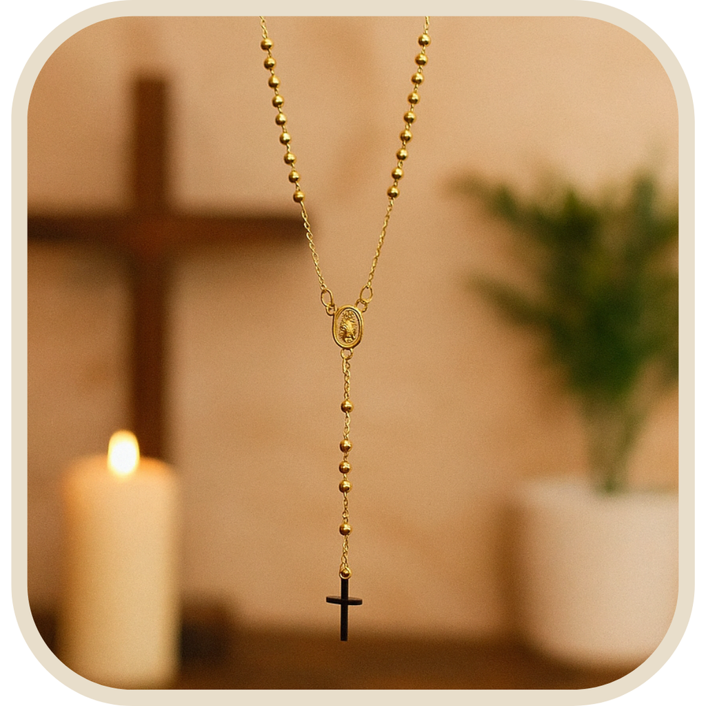 Elegante colar terço com a imagem de Nossa Senhora. banhado a ouro 18k. simbolizando fé. proteção e devoção. Com design delicado e refinado. esta peça é perfeita para quem deseja carregar a presença divina consigo. trazendo bênçãos e espiritualidade ao dia a dia.