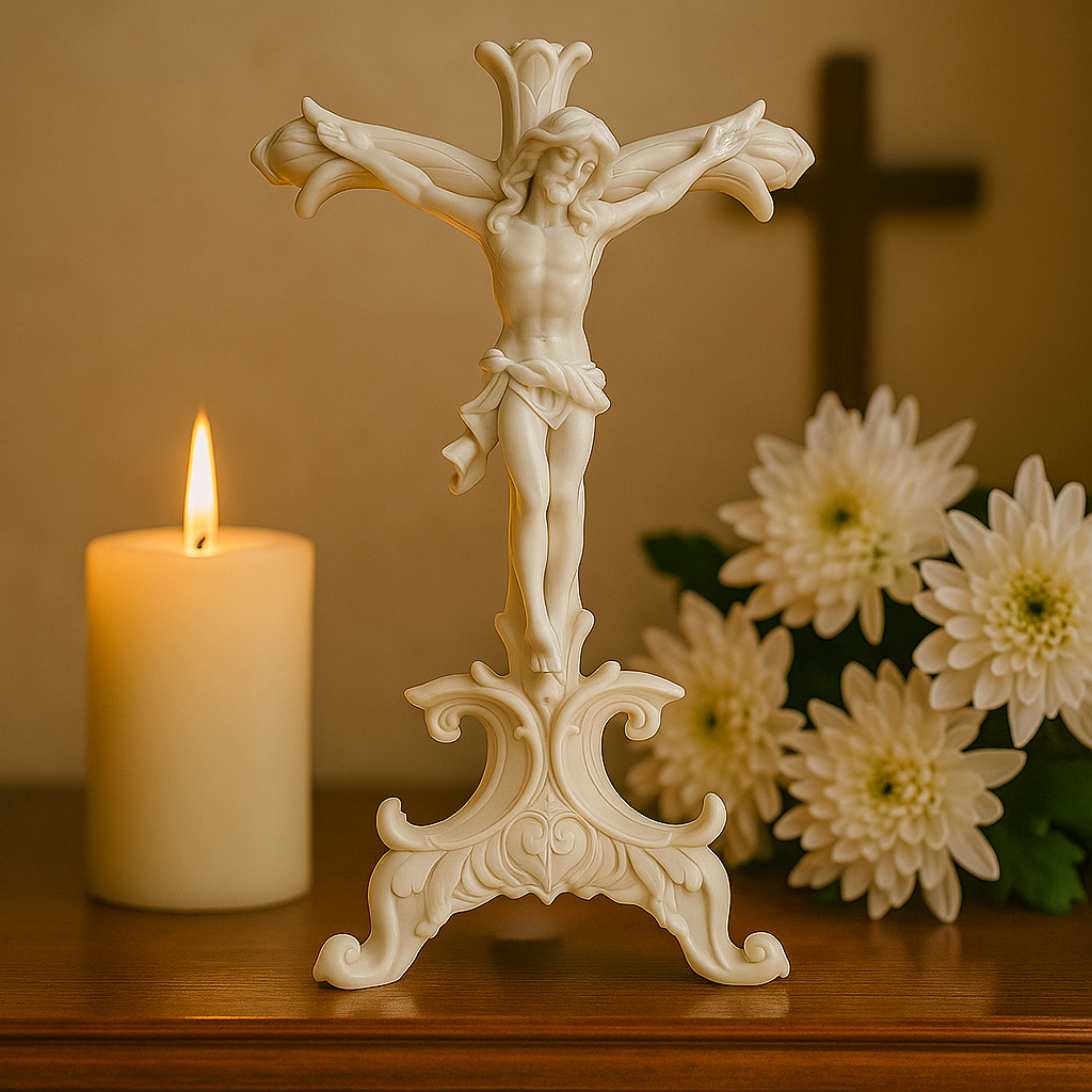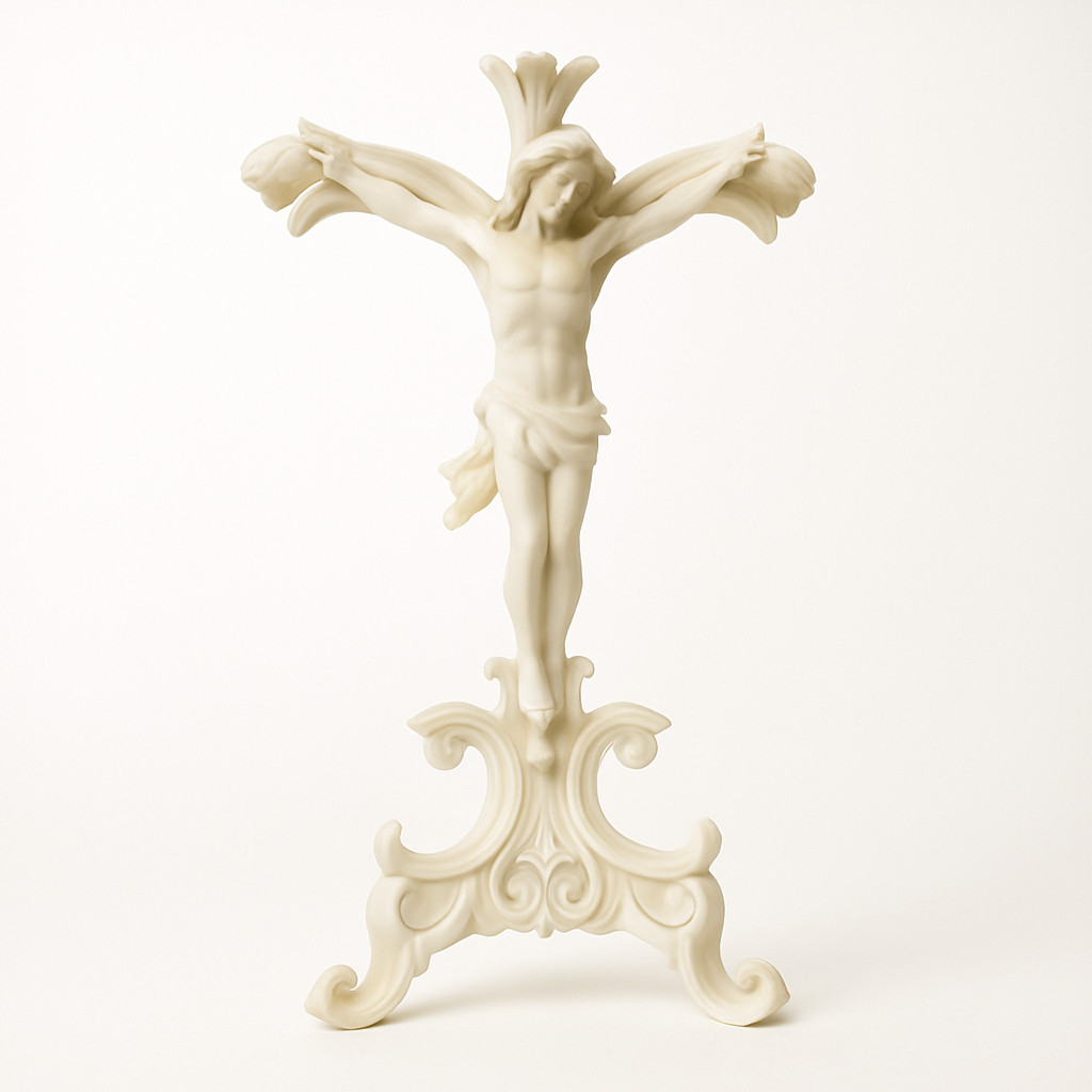 Inspirado no estilo barroco sacro. este crucifixo em resina marfim encanta pela leveza. fluidez e riqueza dos detalhes. A imagem de Cristo glorificado transmite serenidade e fé. sendo ideal para ambientes de oração. decoração clássica ou como presente de devoção.