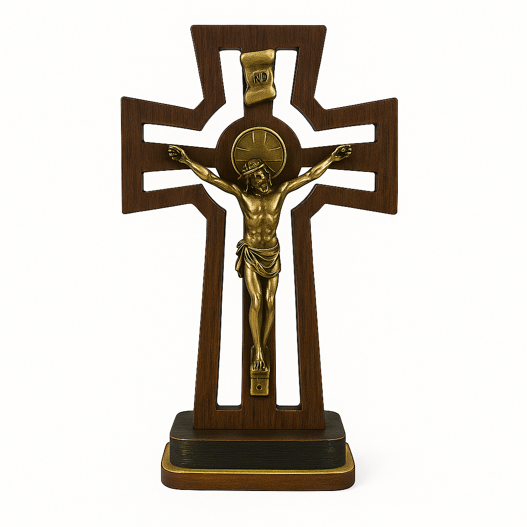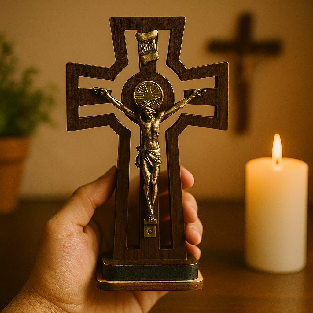 O design vazado moderno valoriza a peça sem perder a essência sagrada da Cruz. Ideal para altar pessoal. ambientes de oração ou como presente especial de devoção cristã.