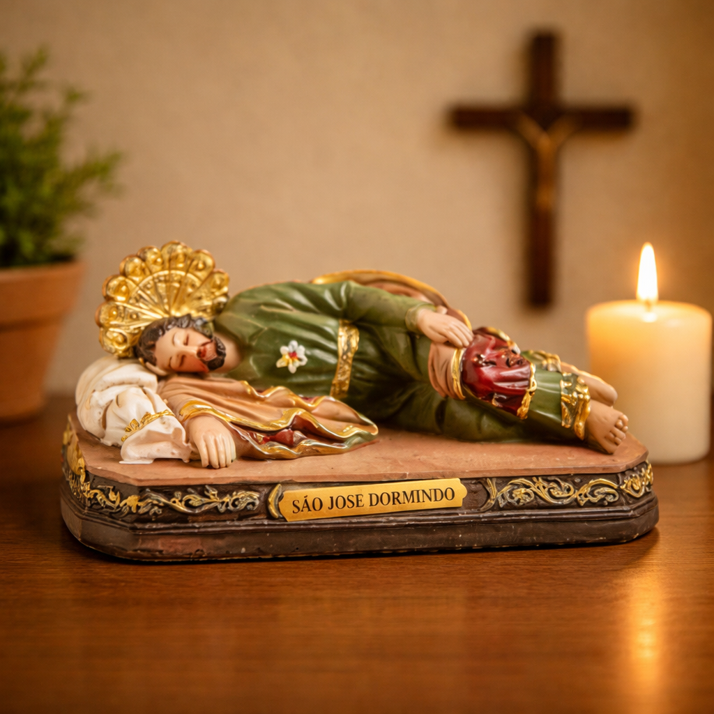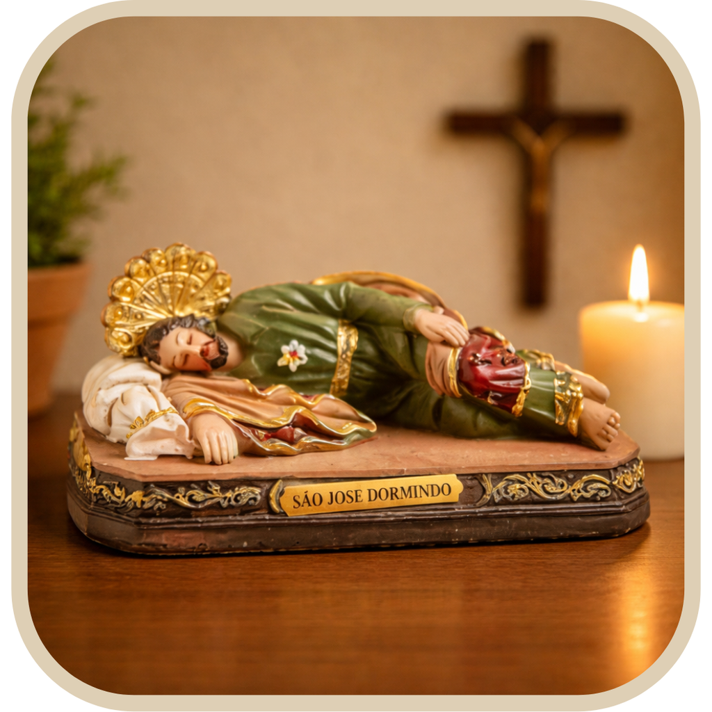 Imagem de São José Dormindo. símbolo de confiança. proteção e cuidado silencioso. Uma devoção especial para quem busca descanso do coração. intercessão e fé nos momentos difíceis.