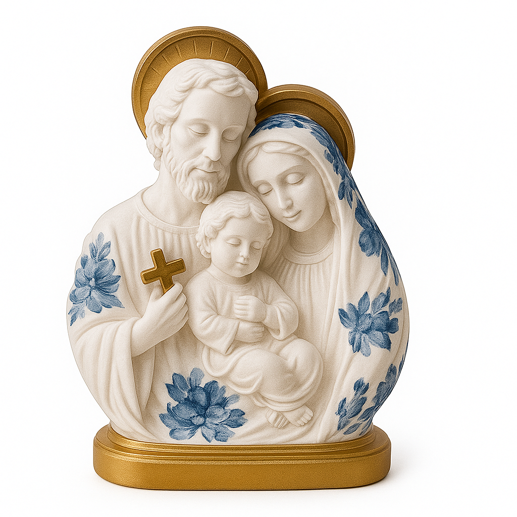 👨👩👦 Imagem Sagrada Família Floral – 20 cm. acabamento dourado com flores azuis pintadas à mão.