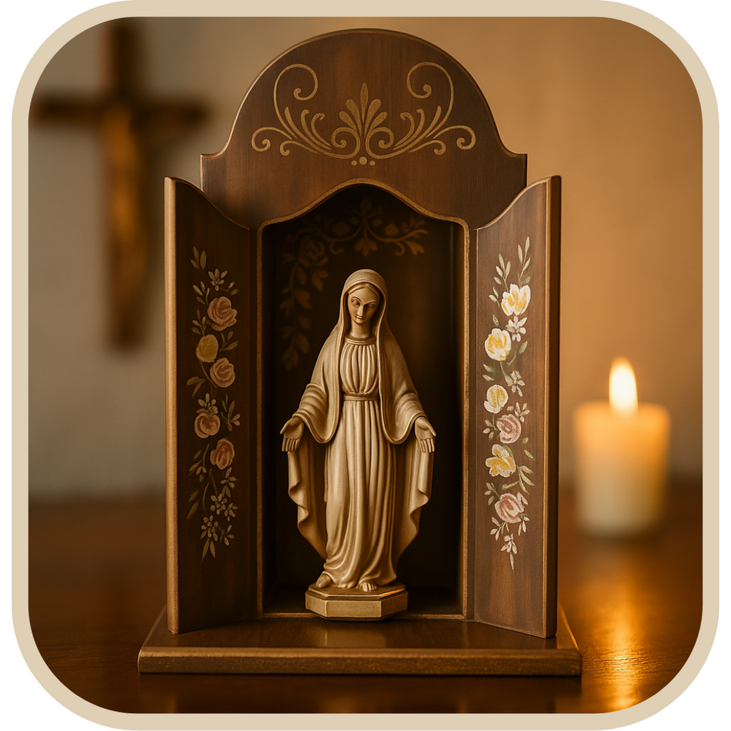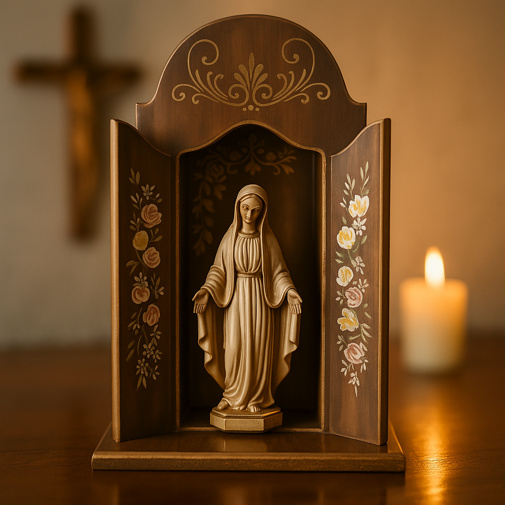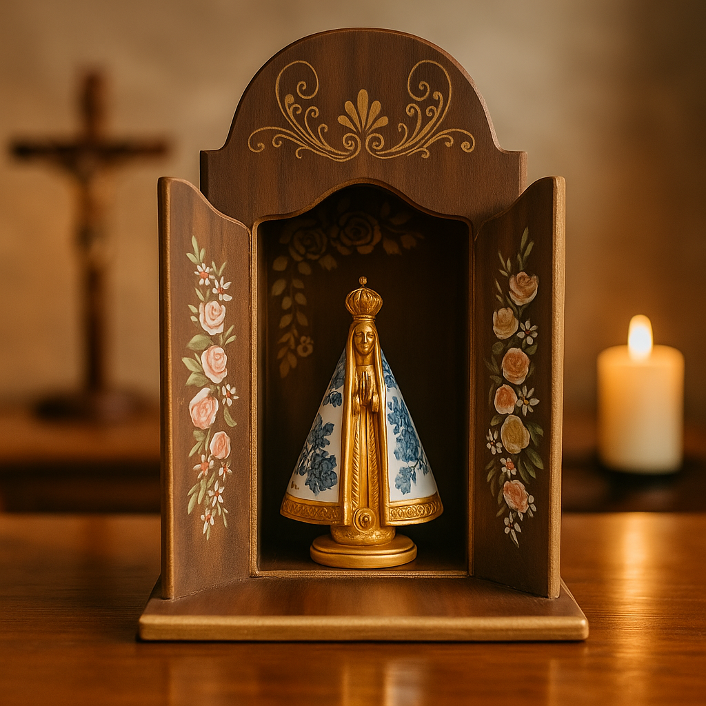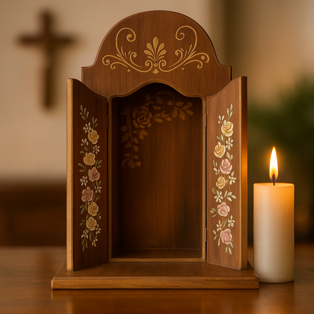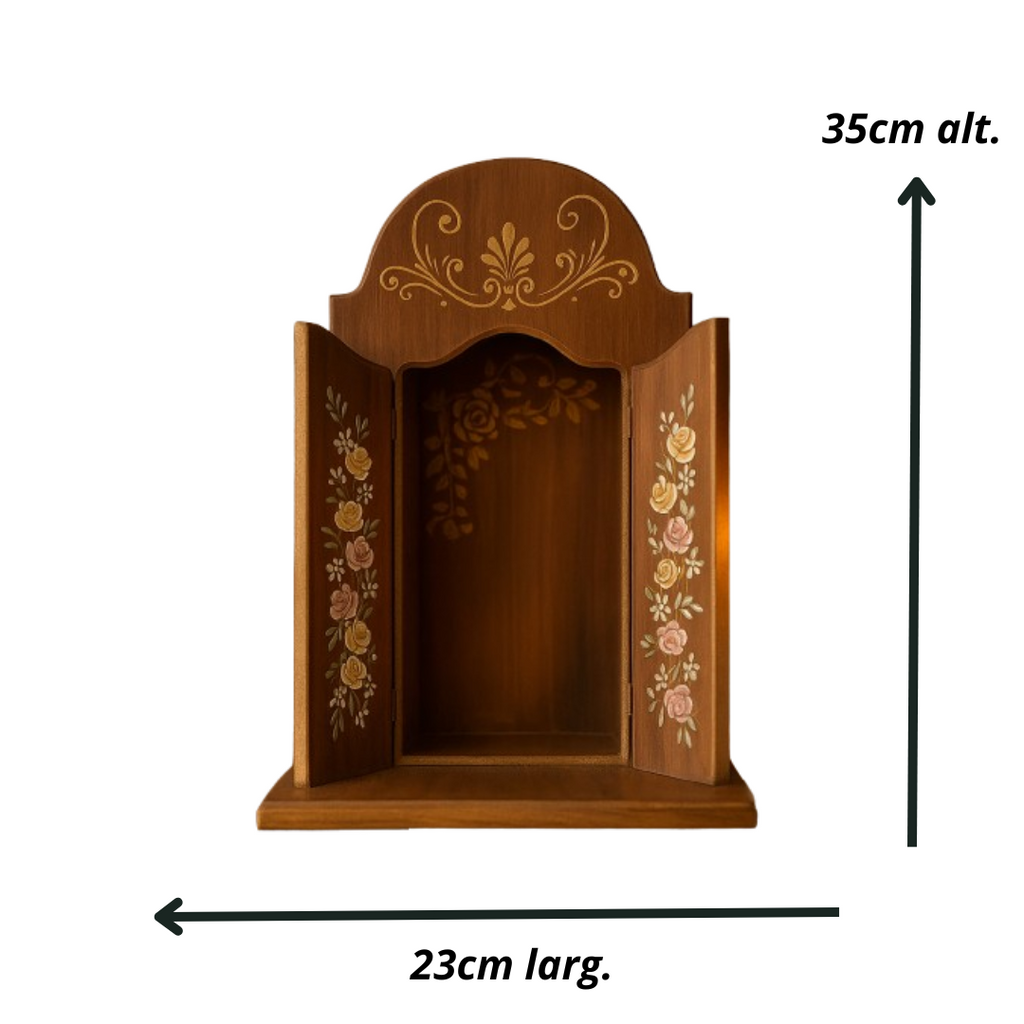 Este oratório foi pensado para tocar o coração. Os traços florais pintados à mão criam um clima sagrado. perfeito para fortalecer a fé e acolher a presença de Deus no lar. ✨🙏