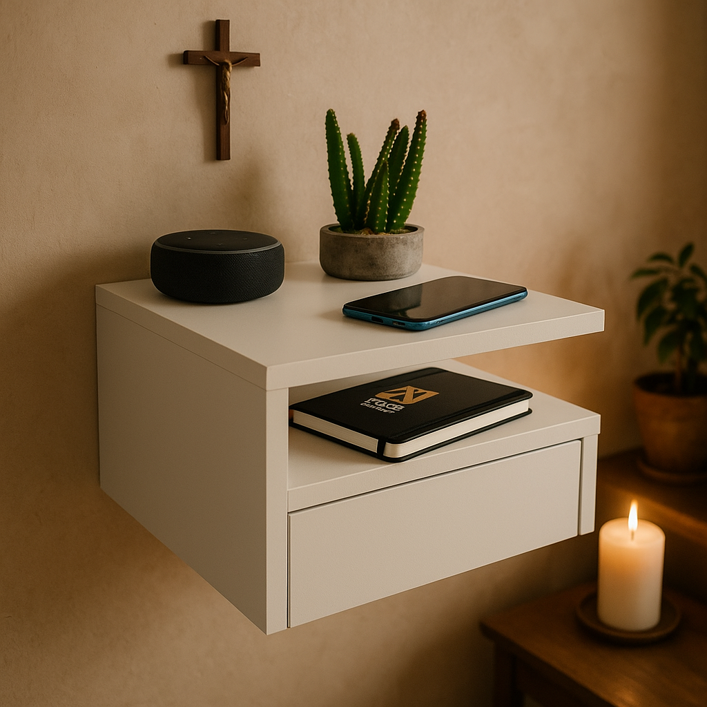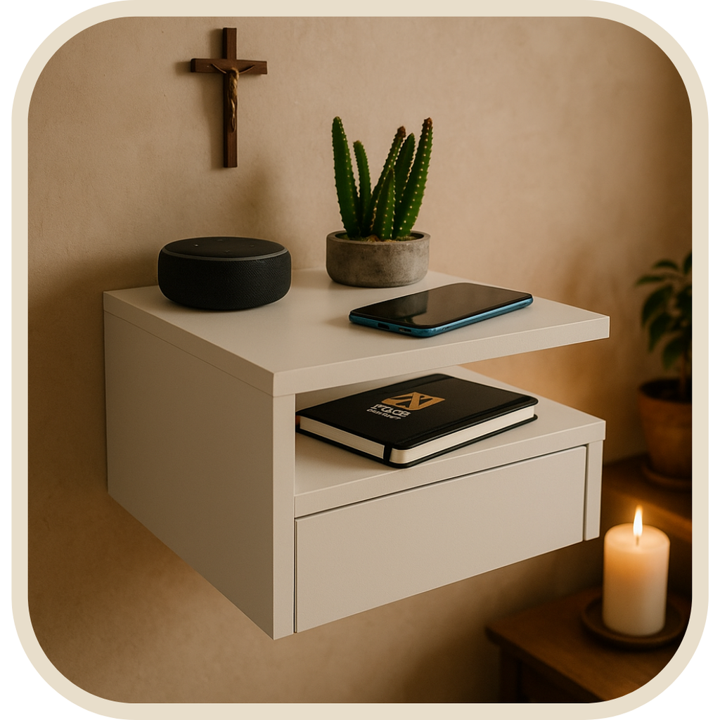 Sofisticada e funcional. a Prateleira Dupla Suspensa com Gaveta é perfeita para quem deseja transformar um cantinho do lar em um oratório moderno e organizado. Produzida em MDF/MDP 15mm com acabamento de alta durabilidade. esta peça une resistência e elegância. sendo ideal para acomodar imagens sacras. velas. terços e outros artigos religiosos. A gaveta espaçosa é prática para guardar livros de oração. escapulários e objetos de devoção. mantendo tudo em ordem e sempre à mão.