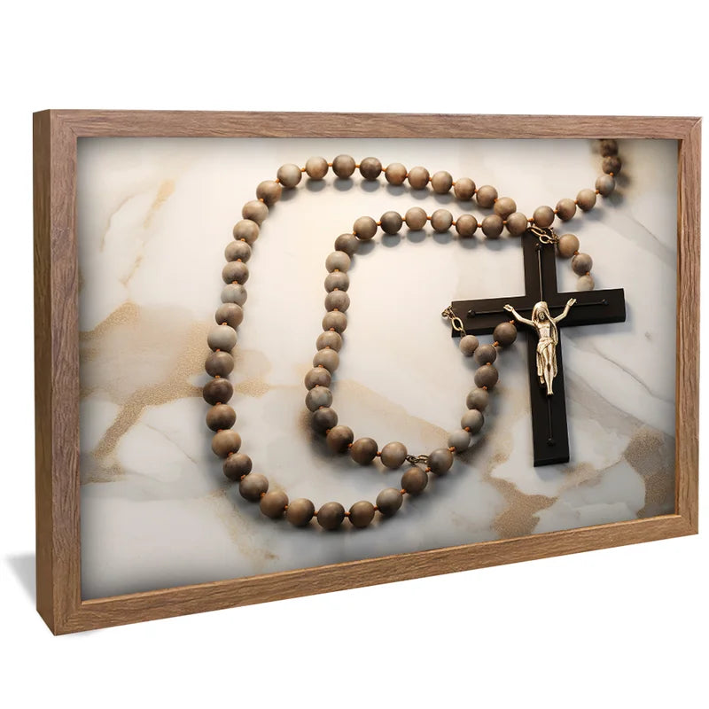 Um quadro que transmite paz. devoção e presença espiritual. Com destaque para um terço elegantemente disposto sobre mármore claro. a imagem ressalta a beleza da oração do rosário e o poder do crucifixo como símbolo de salvação.