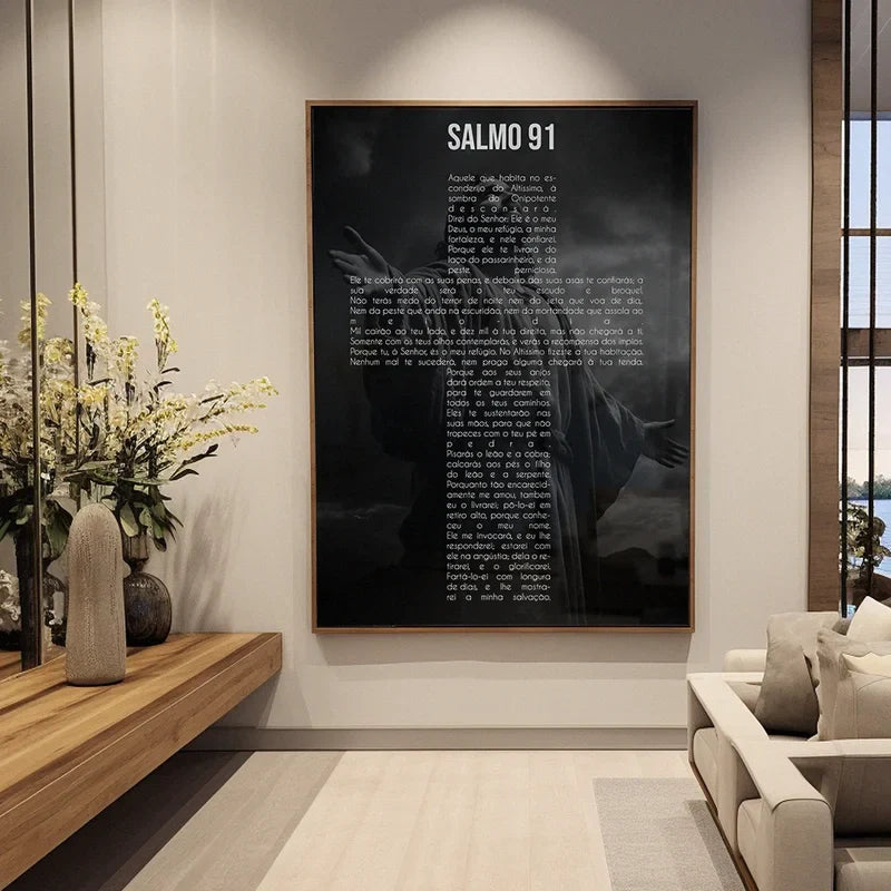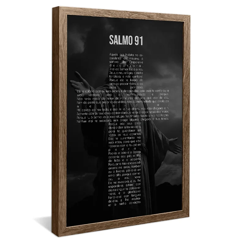 Leve para o seu lar a força espiritual do Salmo 91. impresso com elegância neste quadro impactante que une fé. proteção e beleza. Com fundo escuro e presença serena de Cristo ao fundo. a peça transmite sobriedade e reverência — um verdadeiro escudo espiritual para o ambiente.
