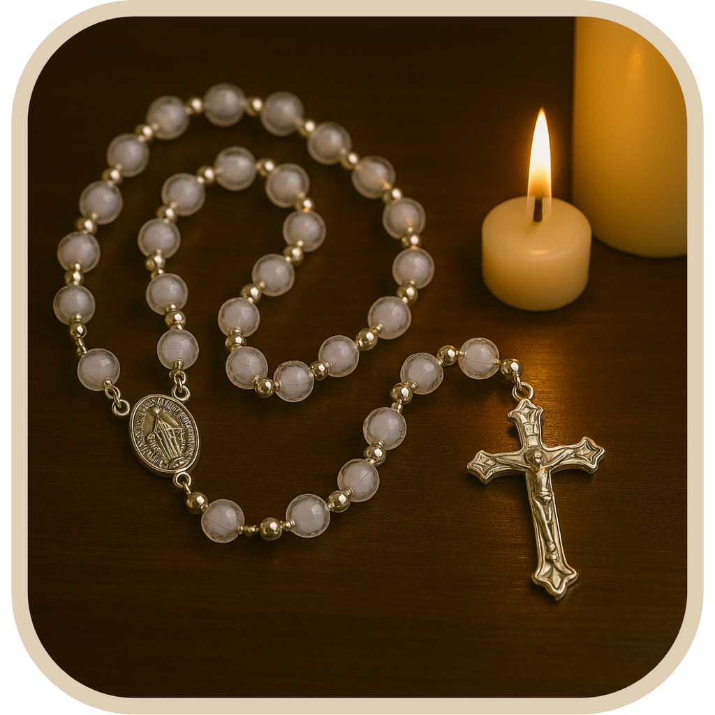 Este lindo terço é confeccionado com contas peroladas translúcidas que refletem suavemente a luz. criando um ambiente de serenidade durante a oração.