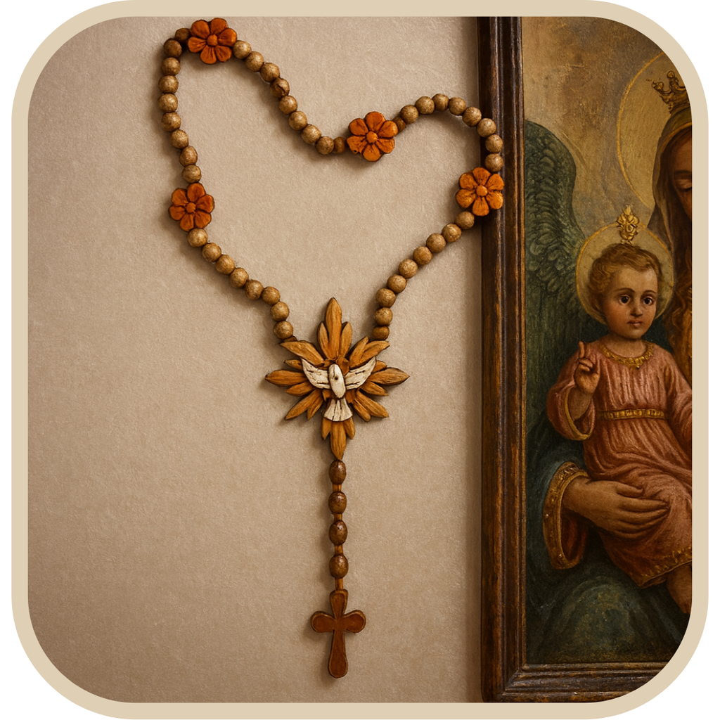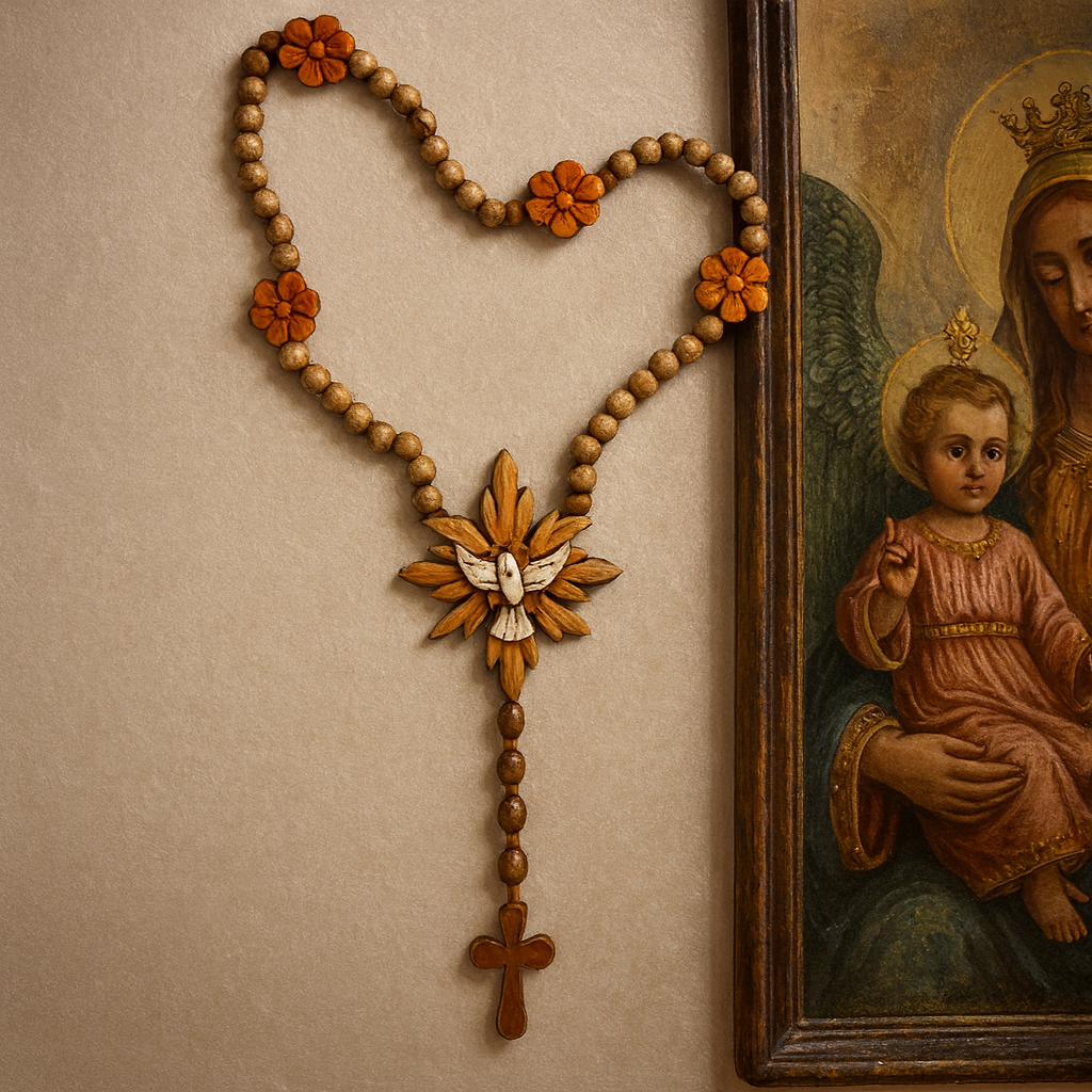Lindo Terço de Parede Artesanal com Divino. feito à mão com contas de madeira natural e acabamento delicado que realça cada detalhe. Com 1 metro de comprimento. é uma peça que une fé. proteção e beleza na decoração do lar.