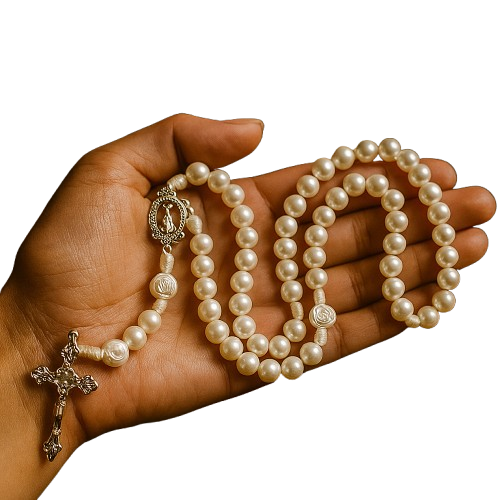 Este belíssimo terço confeccionado com contas em formato de pérola é ideal para momentos de oração e devoção. A medalha central apresenta a imagem de Nossa Senhora. enquanto o crucifixo delicadamente trabalhado adiciona um toque de reverência e sofisticação.