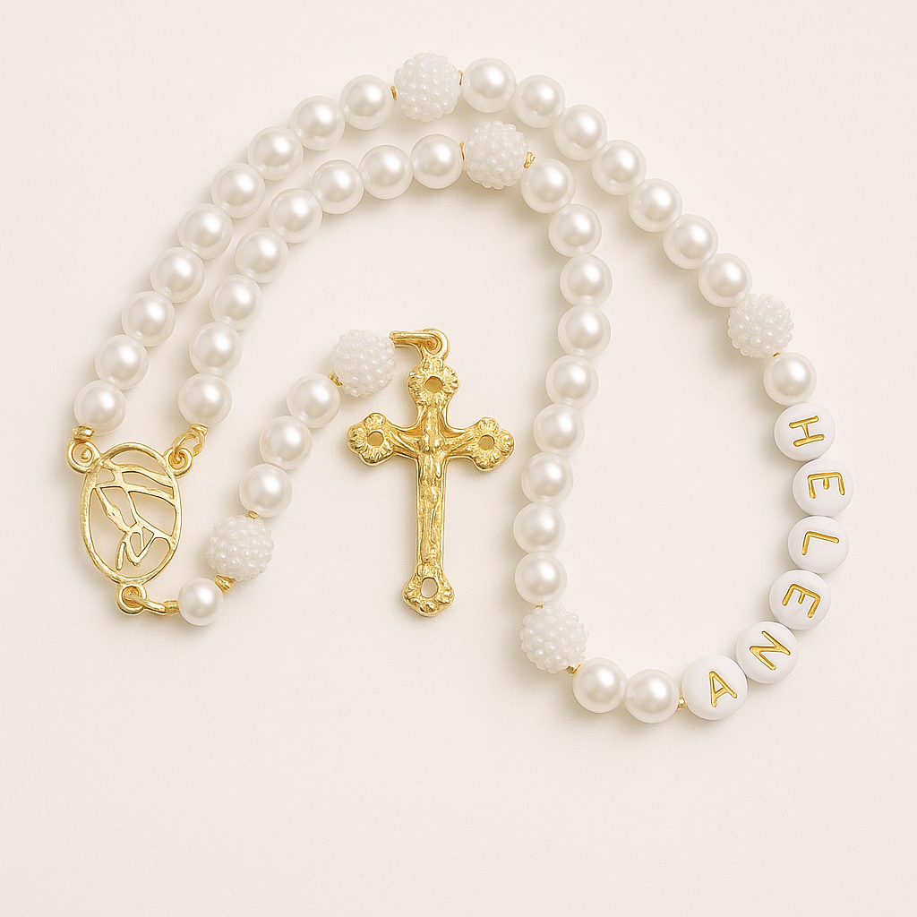 Este delicado terço infantil é confeccionado com contas peroladas brancas e detalhes dourados. perfeito para presentear em batizados. primeiras comunhões ou momentos especiais de devoção das crianças. O destaque fica por conta da personalização com nome. tornando a peça única e cheia de significado. O crucifixo dourado traz um toque de sofisticação e simbolismo cristão.