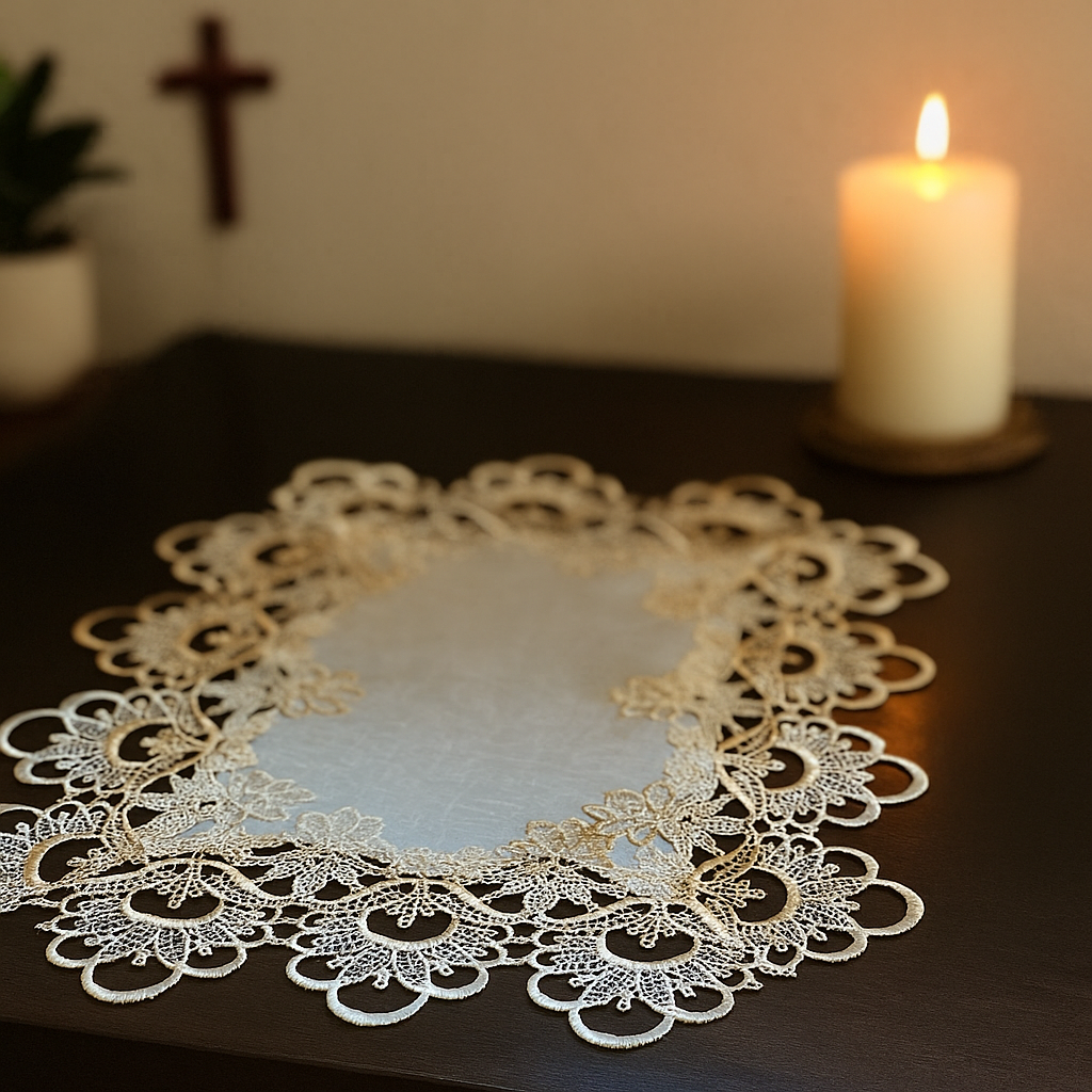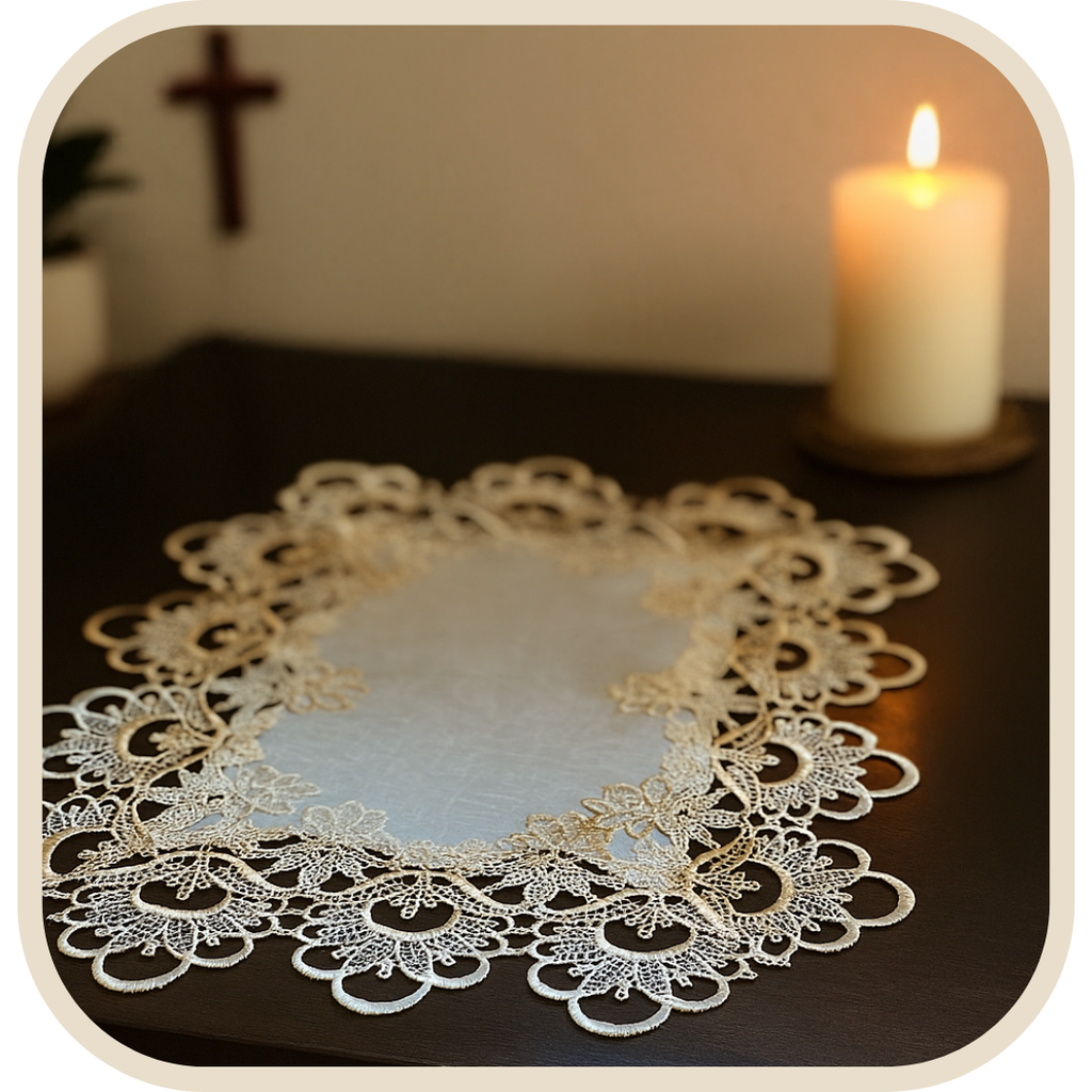 A Toalha Royal traz um toque de requinte e espiritualidade ao seu oratório ou altar. Com acabamento elegante em branco com detalhes dourados. é ideal para valorizar suas imagens sacras ou decorar diferentes ambientes da casa.
