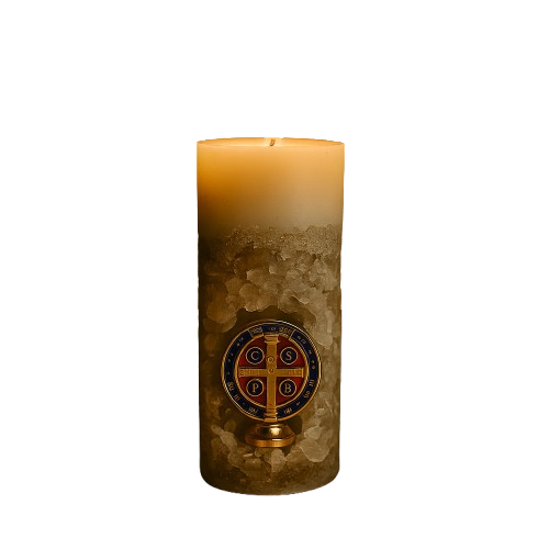 Vela esculpida com a imagem de São Bento. da linha exclusiva Chamas da Alma®. Uma peça que une fé e proteção. ideal para criar um ambiente de oração e fortalecer a espiritualidade com a poderosa intercessão de São Bento.