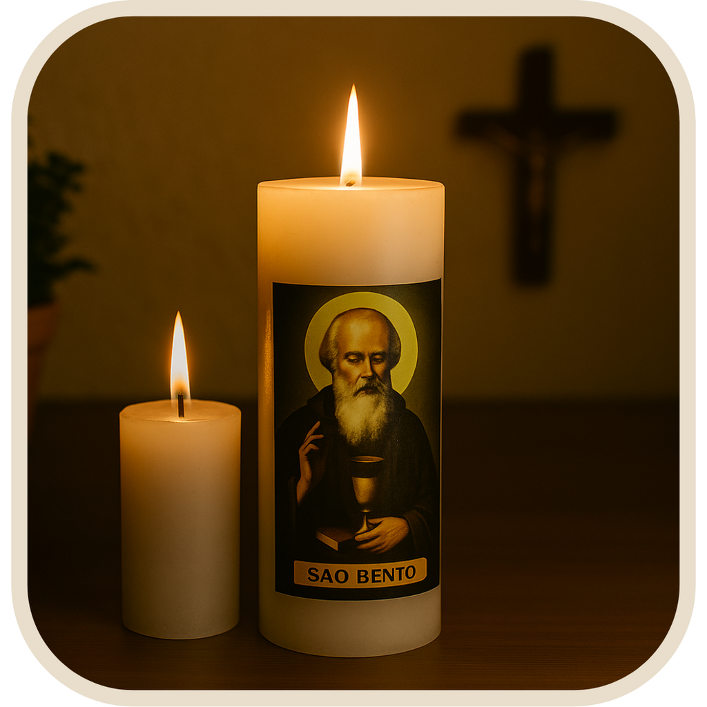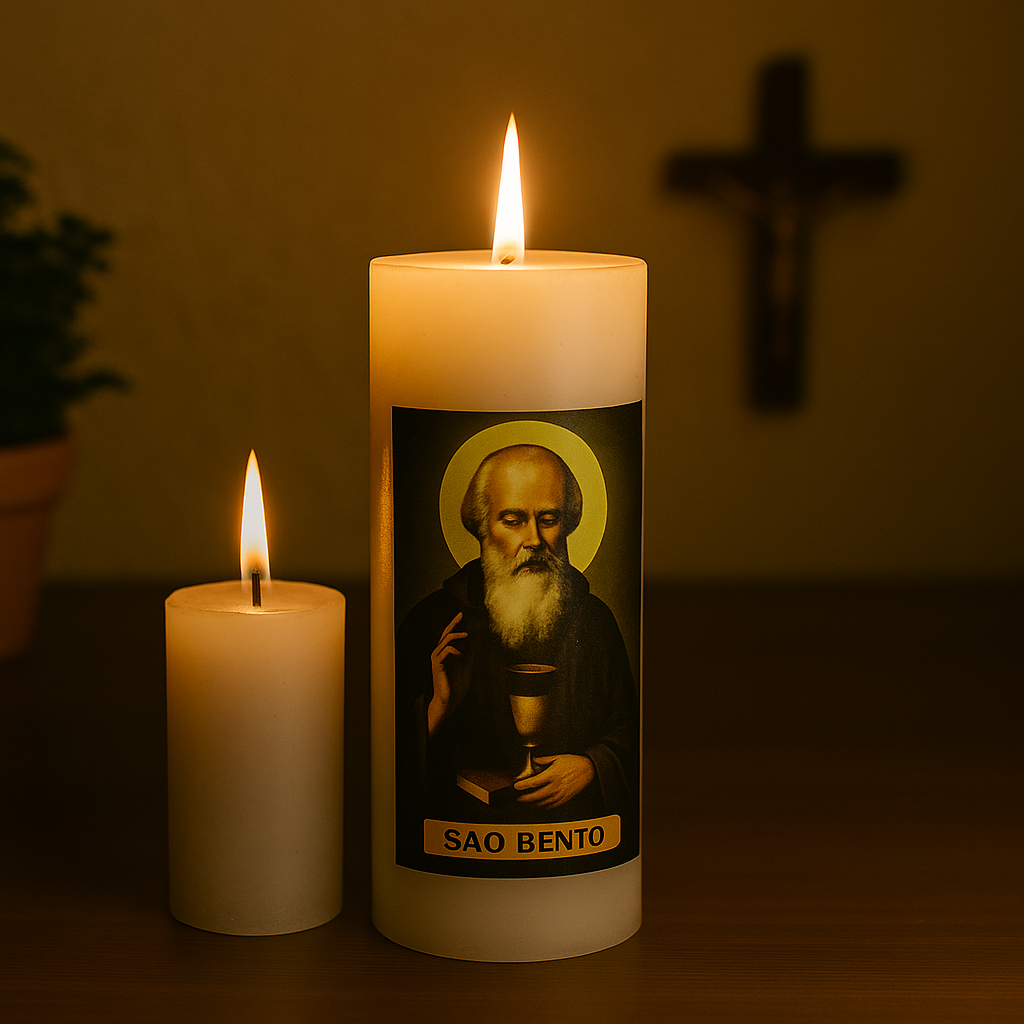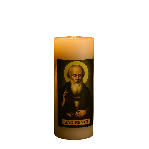 Vela esculpida com a imagem de São Bento. da linha exclusiva Chamas da Alma®. Rica em detalhes e simbolismo. esta peça une arte e devoção. sendo ideal para momentos de oração. fé e conexão espiritual.